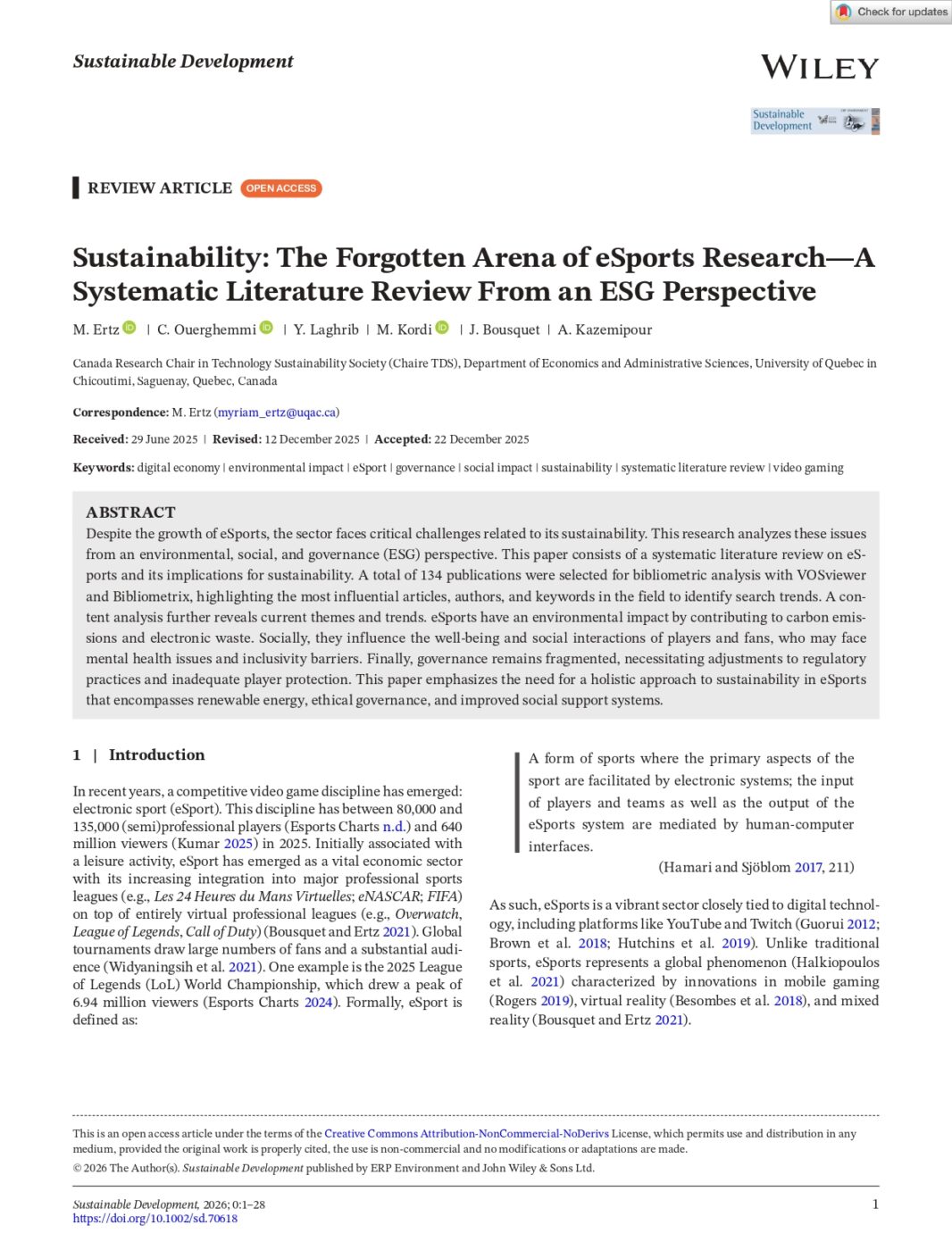 Cet article, publié dans la revue Sustainable Development, s’intéresse à une dimension encore peu explorée des eSports : la durabilité. À partir d’une revue systématique de 134 articles scientifiques, les auteurs analysent les enjeux environnementaux, sociaux et de gouvernance (ESG) liés à la croissance rapide de ce secteur.