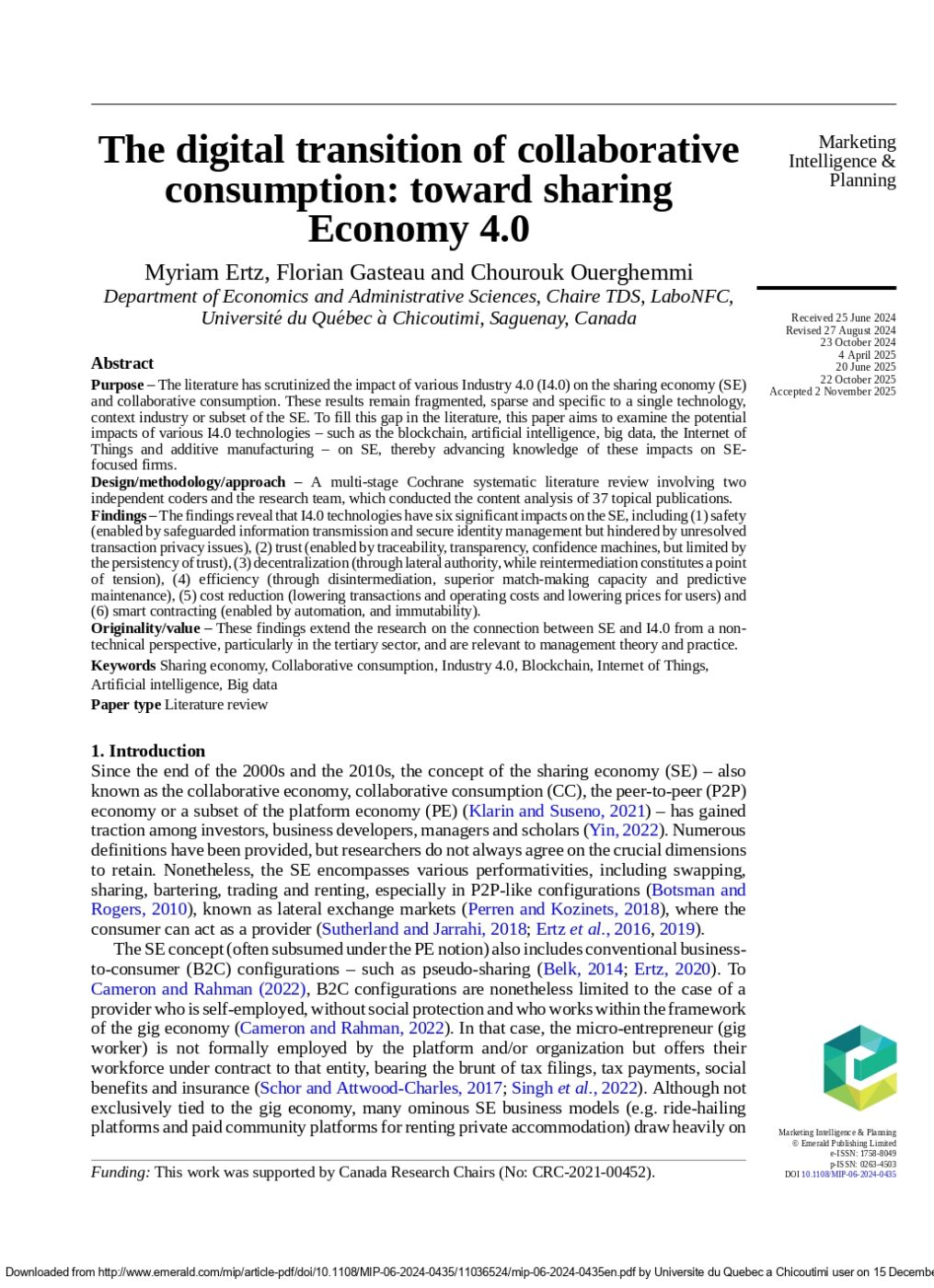 Cet article, publié dans la revue MI&P, propose une revue systématique de la littérature afin d’analyser les impacts potentiels des technologies de l’Industrie 4.0 (blockchain, intelligence artificielle, big data, Internet des objets et fabrication additive) sur l’économie du partage et la consommation collaborative. L’étude repose sur l’analyse de contenu de 37 publications scientifiques, réalisée selon une méthodologie rigoureuse impliquant deux codeurs indépendants.